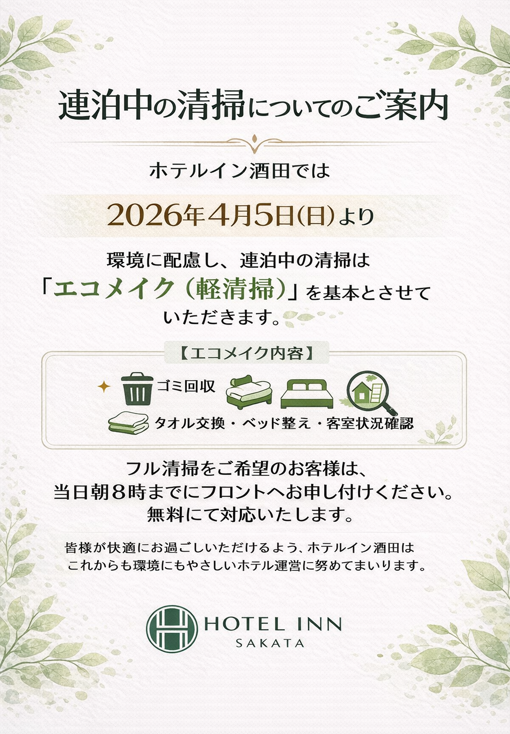 2026年3月15日【重要】連泊中の客室清掃(エコメイク)導入のお知らせ(2026年4月5日より)